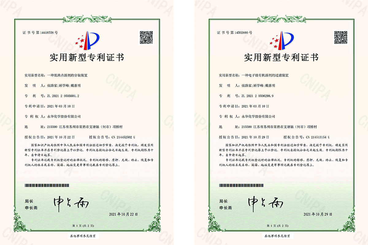 近年來,永華化學(xué)股份一直重視科技創(chuàng)新,不斷引進(jìn)高素質(zhì)人才,加大科研經(jīng)費(fèi)投入,注重知識產(chǎn)權(quán)保護(hù)。目前我司已經(jīng)獲得4項實用新型專利,1項發(fā)明專利,這些專利的獲得為我司日后的發(fā)展奠定了基礎(chǔ),提升了我司產(chǎn)品的競爭力,相信在未來,永華會發(fā)展的越來越好!